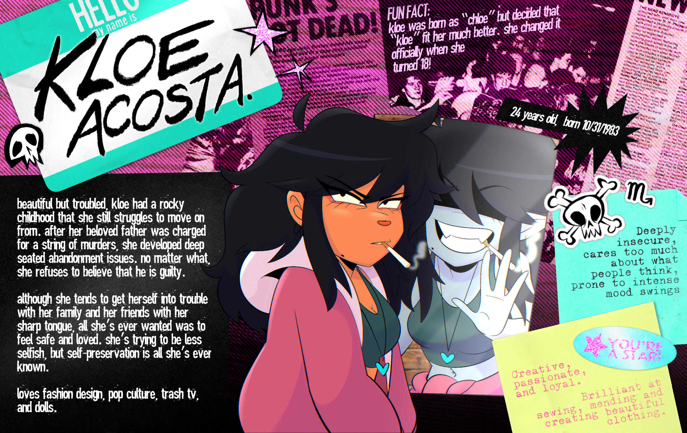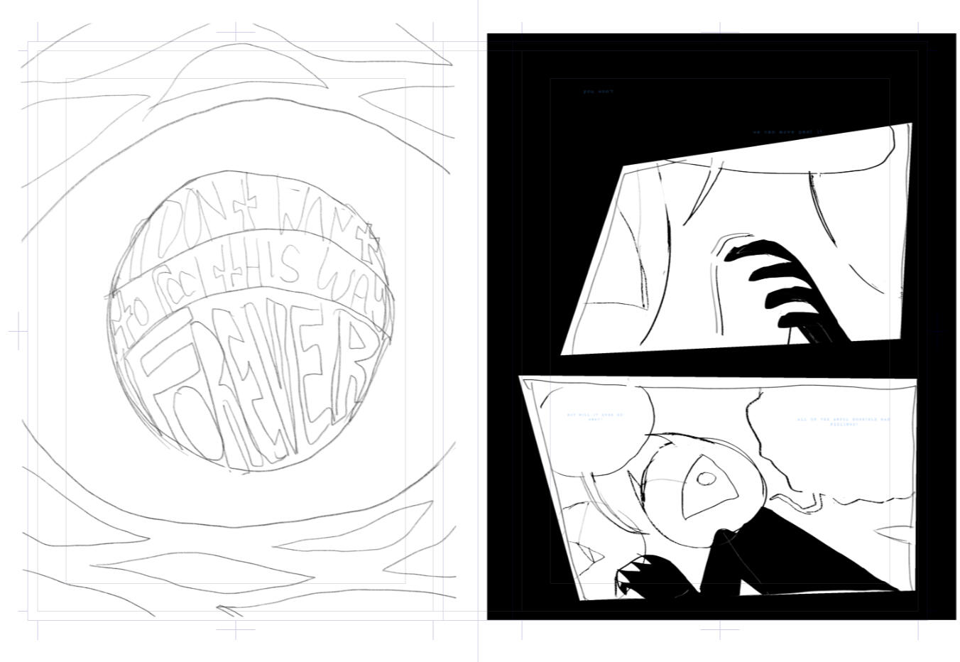 I drew inspiration from the 'portal' itself (which appears as a blue fog), as well as a character from the forest - Drax, a "skele-ghoul" with a skull as his face. With a combination of sharp features and ornate details, the skull evokes a sense of mystery, magic, and unknown dangers. The "eyes" instill a feeling of being watched, similar to how the main characters feel their past looms over them.An organic style was requested to align with a handmade/collaged, punk/grunge, 2000s aesthetic of the characters. The wordmark's lettering resembles words scratched into wood, to juxtapose against the imagery of the town's welcome sign.